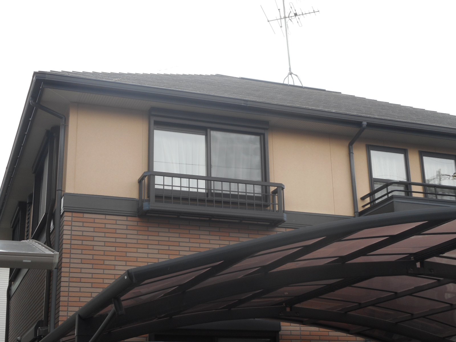屋根のスレート屋根材も塗膜の劣化が確認できましたので、今回は全体的に調和性のある塗装リフォームをご提案させていただきました。